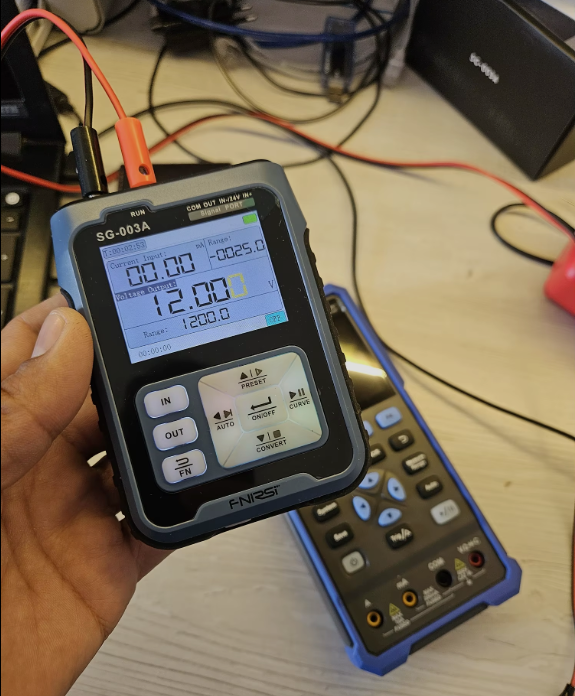 تست و کالیبراسیون لوپ ۴ تا ۲۰ میلیآمپر: استاندارد رایج انتقال سیگنال در فواصل طولانی، جریان ۴-۲۰mA است. سیگنال ژنراتور DC با قرارگیری در حالت Source Current، جایگزین ترانسمیتر واقعی میشود و جریانهای دقیقی (مانند ۴، ۸، ۱۲، ۱۶ و ۲۰ میلیآمپر) را به ورودی کارت آنالوگ PLC تزریق میکند. این عمل برای بررسی خطی بودن مبدلهای آنالوگ به دیجیتال (ADC) ورودی و صحت عملکرد منطق کنترلی ضروری است.