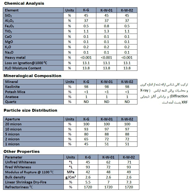 کائولن کاشی و سرامیک مکاکو کائولن ارائه شده یک محصول فرآوری شده است که از خاک خام معادن کائولن در ایران بدست می آید. در طی پروسه فرآوری و چند مرحله خالص به بازار عرضه میشود و براساس گرید آن در صنعت لعاب ظروف و کاشی، K-W-02 ، K-W-01 ،K-G سازی این کائولن در سه گرید با کد های کاغذسازی و لوازم آرایشی و بهداشتی میتواند مورد استفاده قرارگیرد. محل تحویل: اصفهان بسته بندی: به صورت کیسه جامبو 1 تنی در صورت نیاز به اطلاعات بیشتر خواهشمند است تماس حاصل فرمایید.