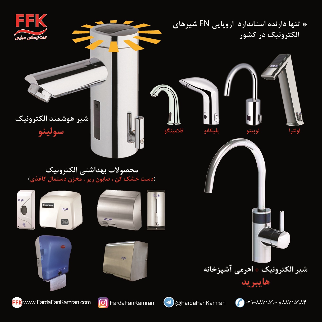 شرکت فردا فن کامران با توجه به پشتوانه و تجارب دو دهه مدیران خود در صنعت شیر آلات بهداشتی و تجهیزات کاهنده مصرف آب وانرژی به صورت کاملاً تخصصی در زمینه تولید شیر آلات هوشمند الکترونیک (شیر آلات چشمی ، شیرآلات سنسوری ، شیر آلات فوتوالکتریک ، شیرآلات اتومات ) فعالیت مینماید.