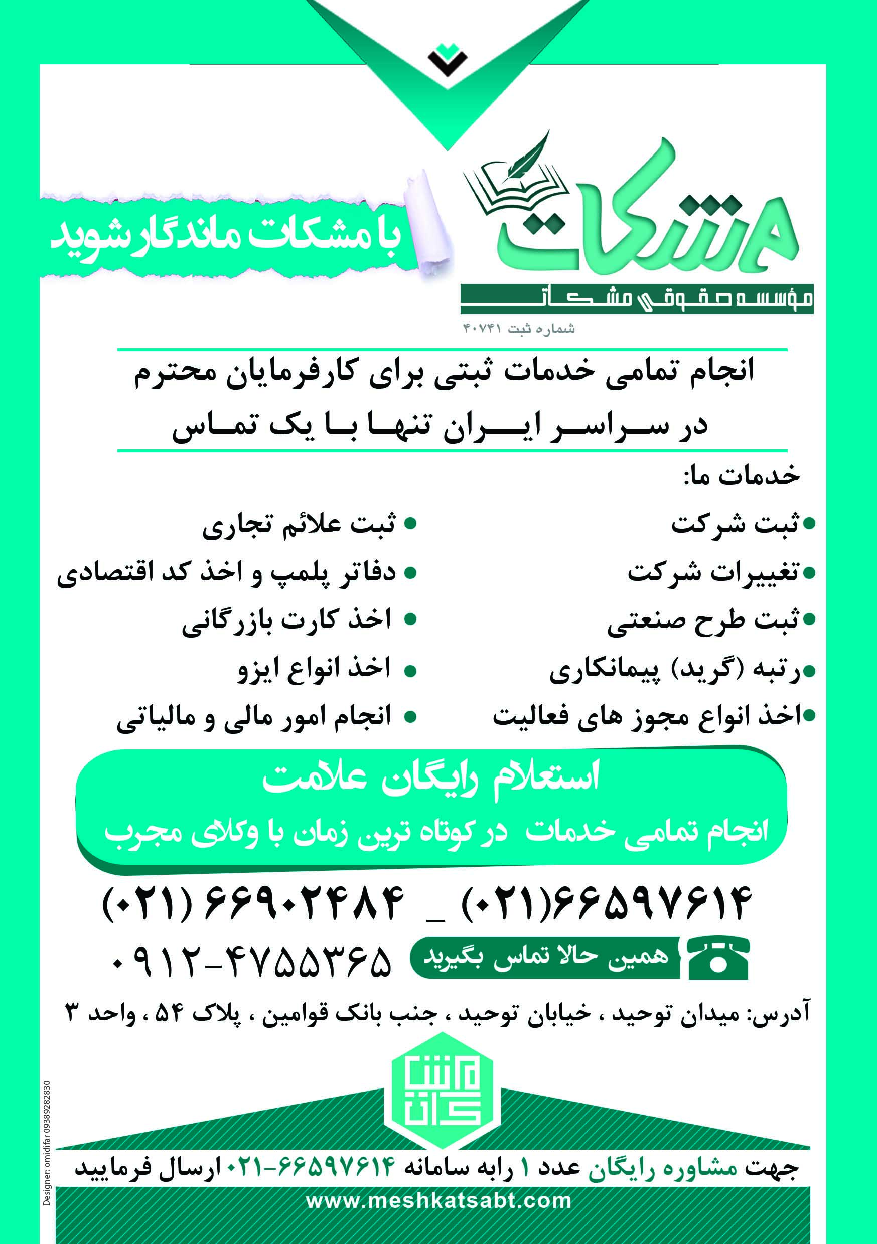 موسسه حقوقی و ثبتی مشکات جهت انجام امور حقوقی و ثبتی شما کارفرمایان عزیز آماده خدمت رسانی میباشد