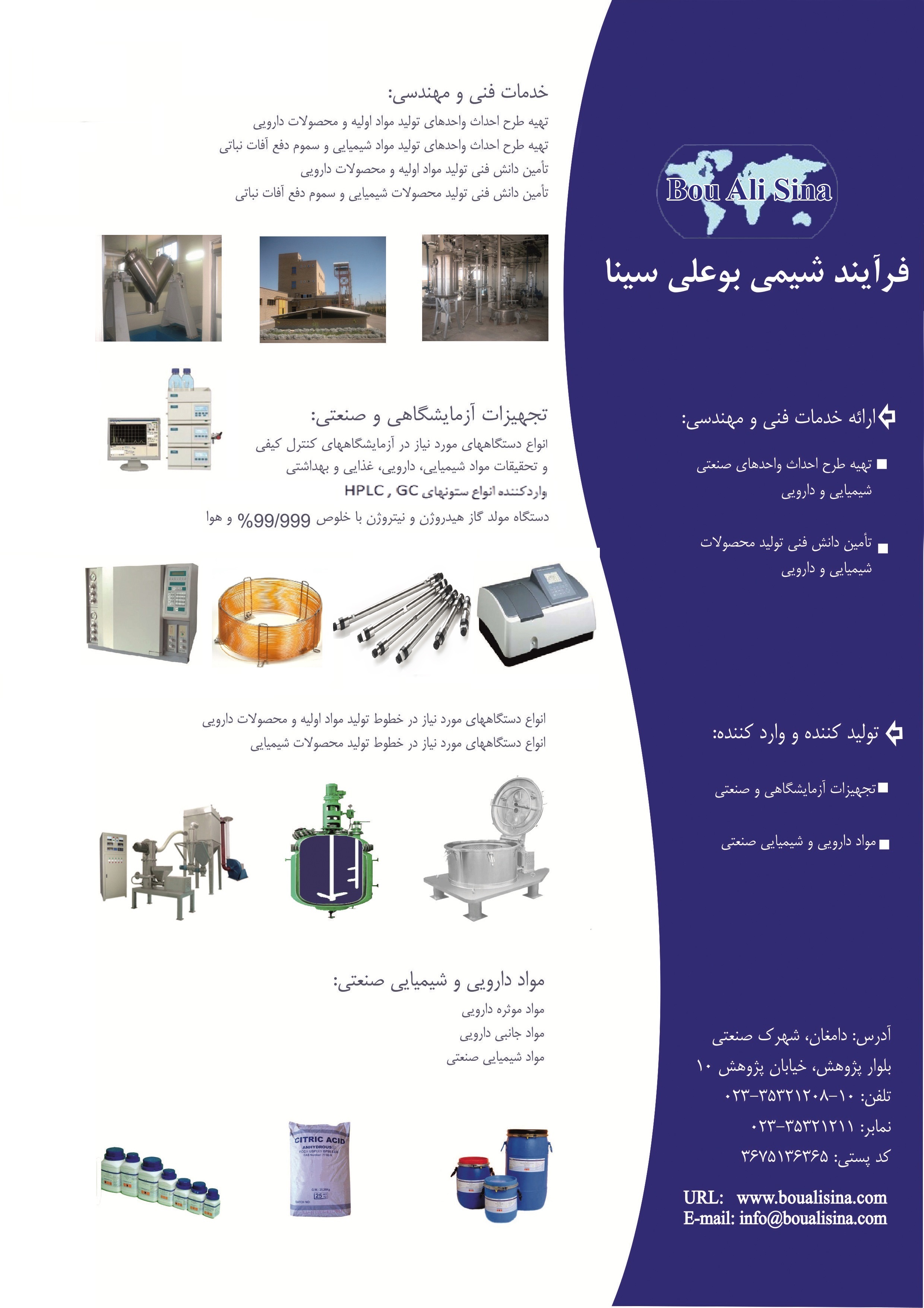 تولید کننده انواع دستگاه های ژنراتور هیدروژن ، نیتروژن و هوا - تأمین کننده انواع ستونهای HPLC , GC - تأمین مواد اولیه شیمیایی ، مواد حد واسط دارویی ، مواد جانبی ( اکسی پیان) دارویی - تأمین رفرنس استاندارد- تأمین دانش فنی تولید مواد موثر و محصولات دارویی - تأ مین تجهیزات آزمایشگاهی و صنعتی کارخانجات دارویی و شیمیایی