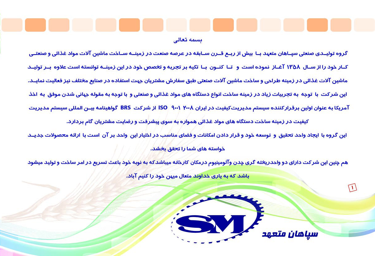 گروه تولیدی صنعتی سپاهان متعهد با بیش از ربع قرن سابقه در عرصه صنعت در زمینه ساخت ماشین آلات موادغذایی و صنعتی کار خود را از سال 1358 آغاز نموده است و تا کنون با تکیه بر تجربه وتخصص خود در این زمینه توانسته است علاوه بر تولید ماشین آلات غذایی در زمینه طراحی و ساخت ماشین آلات صنعتی طبق سفارش مشتریان جهت استفاده در صنایع مختلف نیز فعالیت نماید.