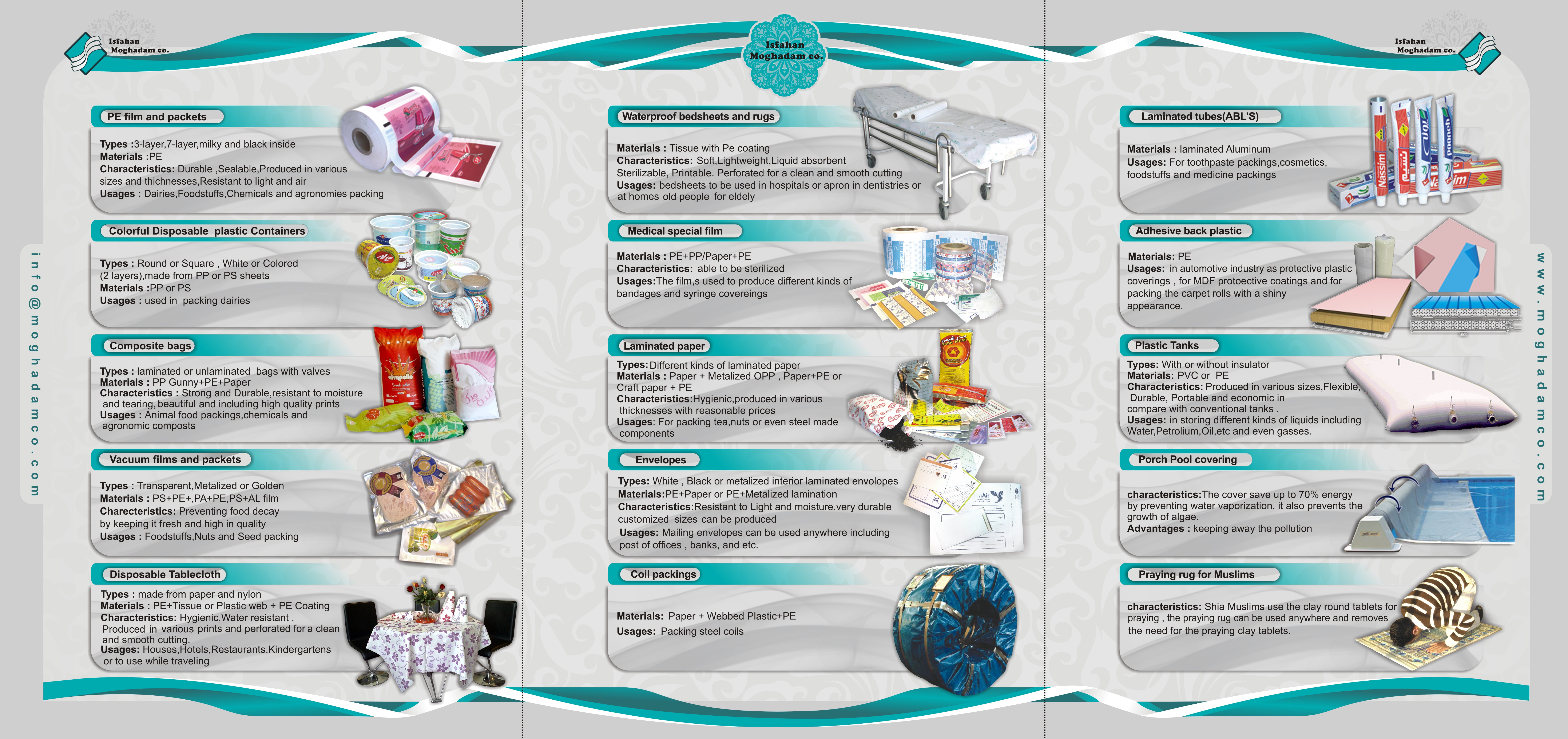 شرکت اصفهان مقدم پیشرو در صنعت پلاستیک چاپ و بسته بندی تولید کننده انواع پاکت و ظروف بسته بندی و سفره های یک بار مصرف بسیار زیبای مصرفی با طرح های چشم نواز با بیش از بیست سال سابقه و دارای گواهی نامه ایزو و..درخدمت مشتریان عزیز می باشد.امیدبه رضایت شما از یک بار خرید از ماست.