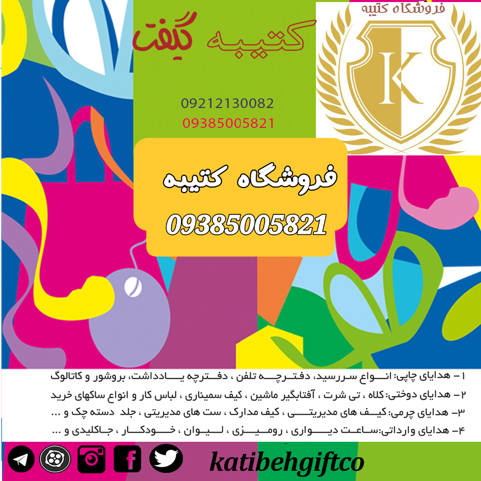 فروشگاه کتیبه؛ با سابقه 10 ساله در زمینه، تولید و پخش هدایای تبلیغاتی . شامل؛ هدایای دوختی: کلاه. تی شرت. افتابگیر. پیشبند اشپزخانه. لباسکار. ساک دستی پارچه ای. برزنت. متقال. هدایای وارداتی: ست مدیریت. فلش مموری. ساعت. لیوان. جاکلیدی. خودکار . هدایای چرمی: کیف مدیران چرم. کیف دیپلمات. جلد دسته چک.جاکارتی دکمه دار هدایای چاپی؛ طراحی و چاپ افست شامل ست اداری.بروشور. کاتالوگ و چاپ ساک دستی گلاسه، ساک دستی کاغذی، شاپینگ بگ , مجهز به کارگاه تولید و چاپ(لیزر.تامپو) حکاکی بر روی انواع قطعات فلزی\ 09385005821 ارتباط تلگرام و اینستاگرام katibehgiftcoکانال رسمی و katibehgiftco 1