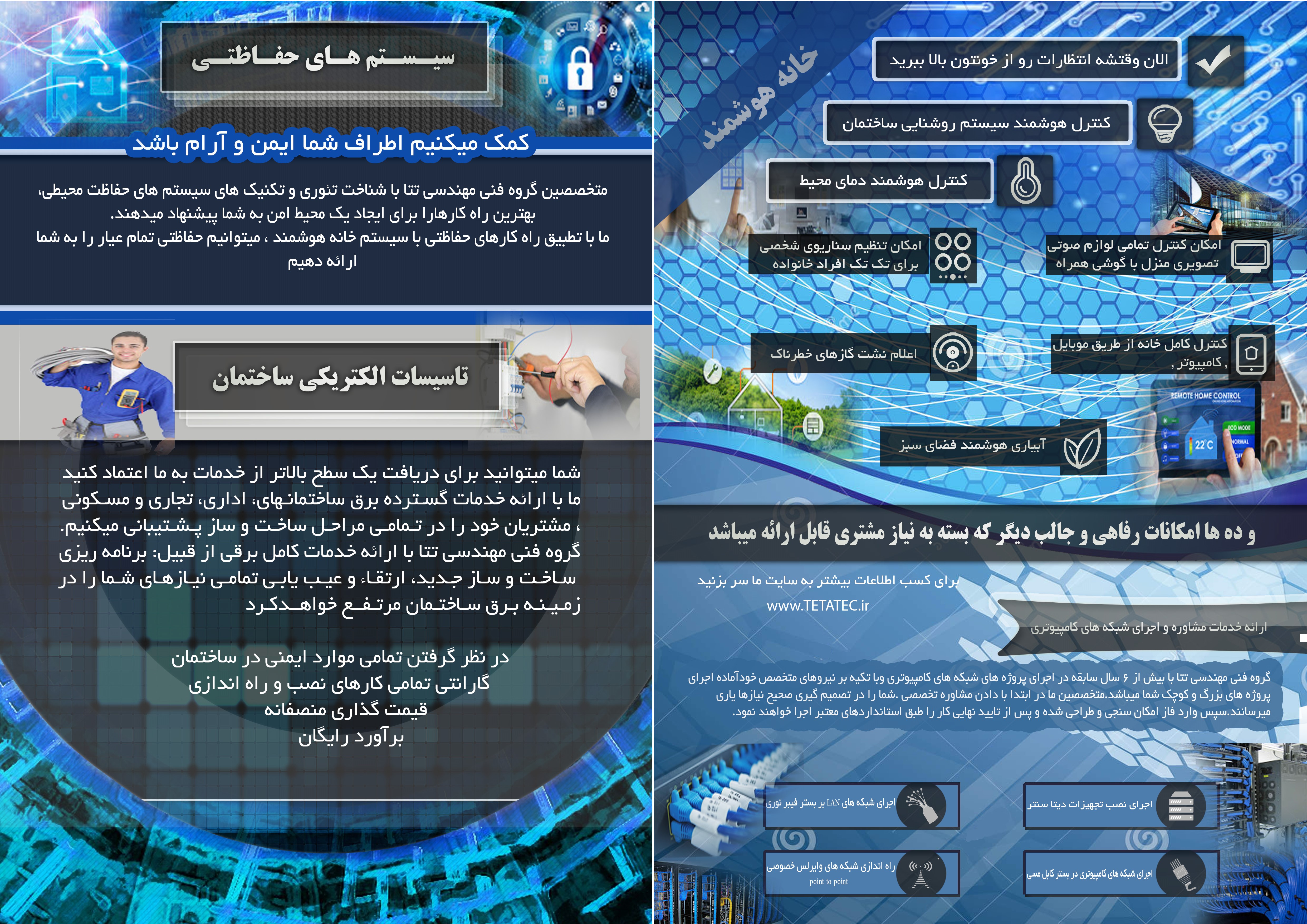 گروه فنی مهندسی تتا (تجهیز تکنولوژی ایران)فعالیت منسجم خود را از سال 1392 با اجرای پروژه های کوچک و متوسط در زمینه های :هوشمند سازی ساختمان , پسیو شبکه , سیستمهای امنیتی و تاسیسات الکتریکی آغاز نمود.و در مدت کوتاهی با بهره مندی از تخصص افراد, انسجام گروهی و انگیزه جوانی و همچنین انجام کارهای محوله به کاملترین شکل ممکن آن توانست اعتماد صاحبان کار و سرمایه را بخود جلب نموده و وارد عرصه های بزرگتر گردد. گروه فنی مهندسی تتا همواره به دنبال ایجاد گسترش همکاریها در زمینه های کاری خود بوده از این حیث آمادگی خود را برای هرگونه همکاری دو جانبه در زمینه های مرتبط و یا حتی فعالیت های نو اعلام میدارد.