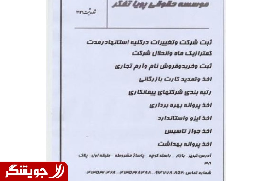 The Institute of legal پویاتفکر registration number 2122 باکادری experienced ووکلای base A in the field of service the following offers : Company Registration Data Services in less than one month Company registration in jolfa, just in a week Record all kinds of changes now (the quotes and the transfer of the stock tank, etc. changes the name of وآدرس and.....) Registered brand وآرم commercial Registration of designs and industrial invention Obtaining a business card Ranking companies Obtaining the Code of economic وپلمپ offices The experts of the Institute every day from 8 a.m. to 5 age, ready to provide advice and services update are. For more information bashmarh, (At the bottom of the ad)(At the bottom of the ad)4135260428 call .