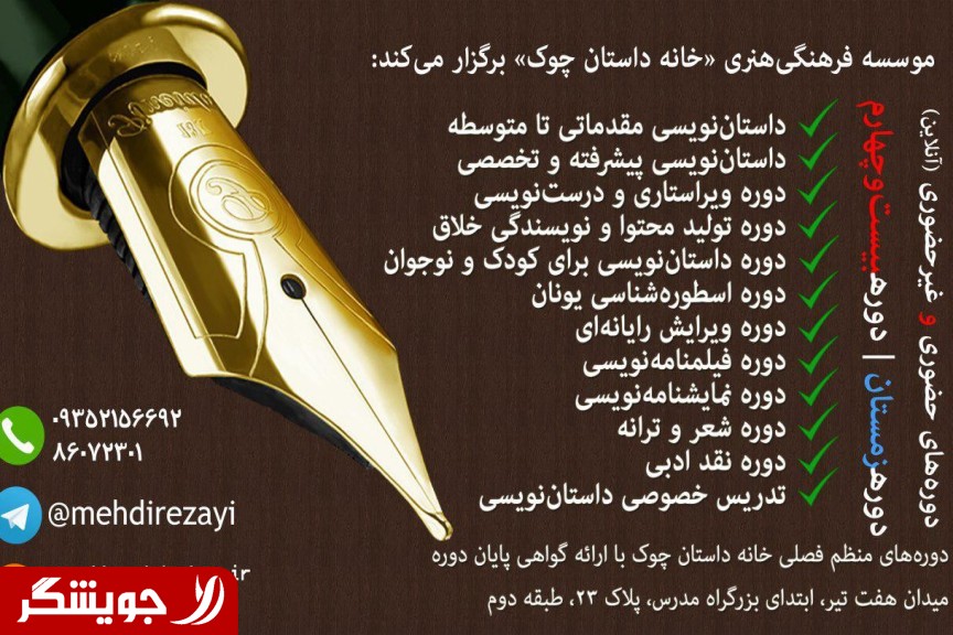 Registration Winter Course story house, Chuk began. (And distance attached to the class) http://www.khanehdastan.ir register here. (Institute story house, Chuk, Institute for specialized literature, fiction) دوره #داستان_نویسی دوره #ویراستاری_و_درستنویسی دوره #فیلمنامه_نویسی دوره #نمایشنامه_نویسی دوره #تولید_محتوا and #نویسندگی_خلاق course #نقد_ادبی دوره #اسطورهشناسی_یونان دوره #داستان_نویسی_برای_نوجوان دوره #ویرایش_رایانهای دوره #شعروترانه @mehdirezayi (At the bottom of the ad) http://www.chouk.ir, t.me/chookasosiation