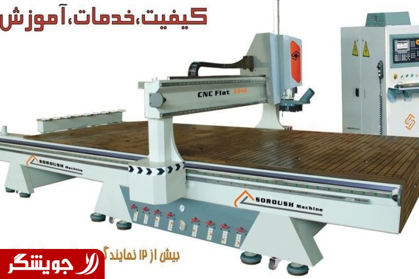 Soroush Machine Wood CNC Machine Suitable for service workshops and engraving, carving, and cutting MDF wood sheets Equipped with a heavy chassis to prevent vibration. Machined and stress-relieved for high precision Includes anti-vibration base Power transmission via rack and pinion. Rails and wagons on X and Y axes, ball screw on Z axis - 7 to 9 kW spindle motor - thick fiberboard table - fully industrial Radonix controller - includes remote controller - complete computer system High-power servo motors, use of planetary gearbox for axis movement Equipped with pneumatic jack on Z axis for better balance Includes dust pad to protect rails and gears