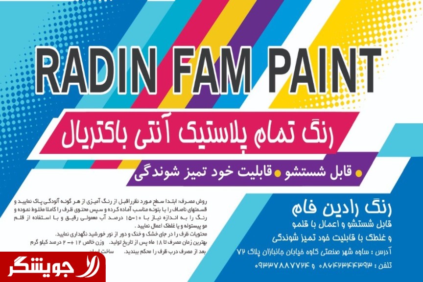 Sale colors all plastic and semi-plastic Nano special sale colors, construction, Nano رادین shades شرکت رادین shades آنتی antibacterials, etc. self-cleaning and washable تولید with nano-materials call to purchase and obtain the representation: (At the bottom of the ad) (At the bottom of the ad) (At the bottom of the ad) (At the bottom of the ad) آدرس : Saveh, Markazi, Iran Kaveh Industrial City, the veterans, etc., No. 72