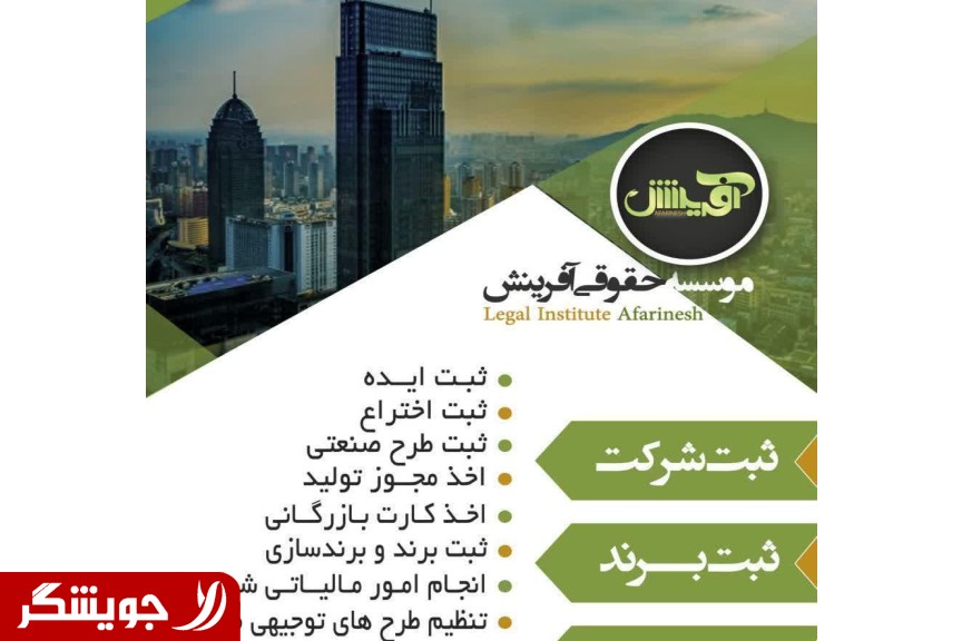 ثبت a variety of commercial companies • Co., Ltd • Joint Stock Company • A Public Joint Stock Company • co-op • a surety company • Co-relative • mixed company of Joint-Stock • co-mixed, non-Joint-Stock • knowledge base companies • a variety of non-commercial institutions انواع minutes changes companies • change address • insertion and change the subject • increase and reduction of capital • entry and exit of shareholders • change the board members • change the right to sign • extended members and auditors • the adoption of balance sheet, financial • transfer stock • the establishment of branches and representation • and other minutes related انجام state tax • obtaining offices plumbed annuity • filing tax • getting codes 12-digit • getting codes 16 digit • filing VAT • provide returns seasonal • provide declaration annual ثبت types of ownership of industrial and intellectual • record all kinds of brand English and Latin • register the brand in Madrid • register the brand in 45 class work • branding • خدات the protection of the brand, • brand and branding, • record a variety of designs, Industrial • record a variety of invention خدمات administrative • set layout plan • obtaining from the establishment of industries • obtaining the operation license • obtaining a solvent • obtaining Iran Code • obtaining the standard • obtain and renew business card • ranking of companies خدمات advertising • web design • SEO and site optimization • provide the services of a virtual advertising • design a variety of logo and brand • design and print stationery