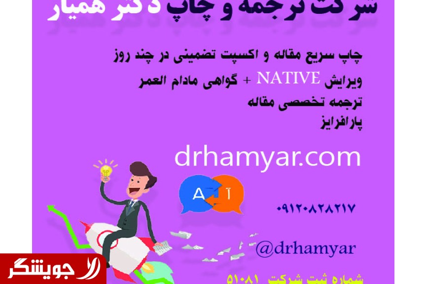 Specialized translation of scientific articles book translation Translation of company brochures in all languages NATIVE editing and translation with a lifetime certificate Increasing article citations Participation in the publication of the article Fast printing of the article and the main exp of several days Paraphrasing Strengthening and correcting the article Please visit DRHAMYAR.COM for more information and place an order or call 09120828217. Company email mailto:DR.HAMYAR@GMAIL.COM