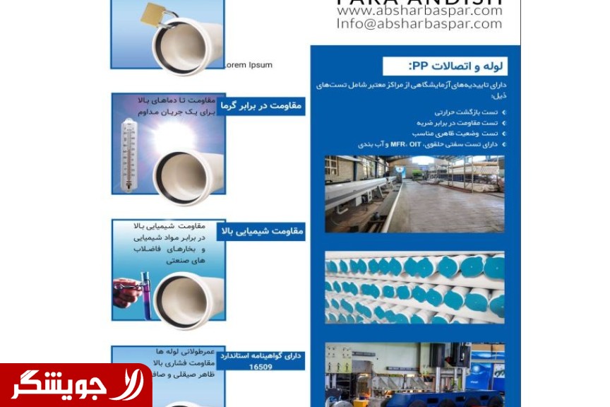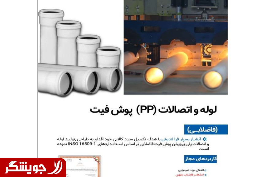 Abshar Baspar Farandish Company, with the aim of completing its product portfolio, has designed, produced polypropylene pipes and fittings for sewage fittings according to INSO16509-1 standards. Pipes and fittings of this company have laboratory approvals from reputable centers.