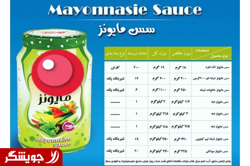 These products in a single company that has an experienced staff and expert nutrition وازمایشگاهی international ودستگاهای, the preparation of واماده export. سس, mayonnaise, a rich source of vitamin E and other nutrients. 231 warm, mayonnaise, etc. 769 calories. 11 g saturated fat, etc. 77 grams of fat, etc. 45 grams of fat a few non-saturated and 18 g fat mono unsaturated. Carbohydrates this amount of sauce, mayonnaise, etc. 15 G. 10 grams of sugar. This amount of sauce, mayonnaise, etc. 4916 mg امگا3 And 40131 mg امگا6. Sauce, mayonnaise, etc. a rich source of vitamin K, choline, and minerals such as potassium, etc., selenium and sodium.