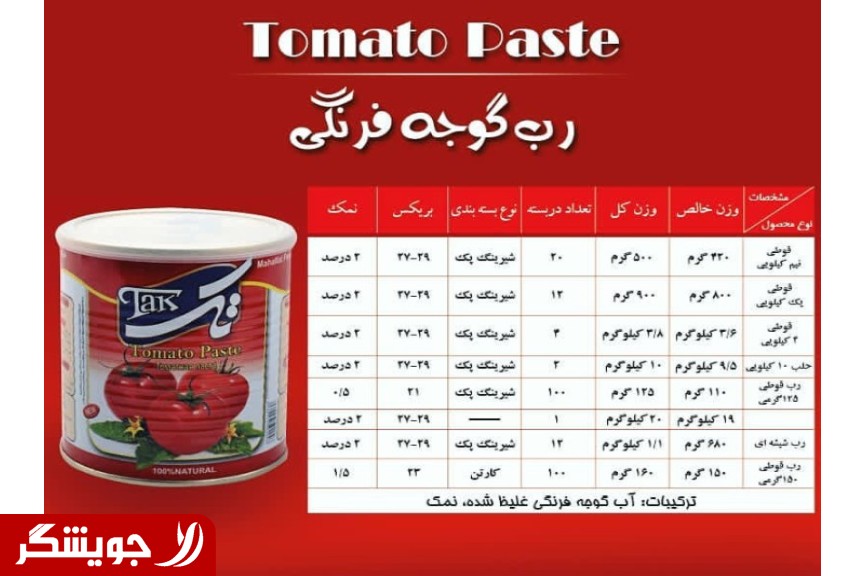 2 tablespoons tomato paste (30 grams) ترکیبات water, tomato, smooth, and condensed, and salt انرژی 21 kilo in Gulfood قند 3/54 G چربی0.13گرم نمک 0.54 g اسیدهای trans fatty 0 g ICON two types of glass وقوطی canned دراندازهای different رب tomato تک0 12 Grammy رب of tomato, a single 140, warmth, رب of tomato, a single 500 grams رب tomato, single door, easy open شو800گرمی رب tomato, single door, easy بازشو4کیلو رب tomato single 20 کیلوی رب tomato glass 750گرمی رب, tomato, glass, 1000-Grammy رب tomato jar 1500, warmth, تحویل year 1398 in Iran صبح Thursday an hour and twenty eight minutes and twenty seven seconds 1:28:27 یکم April 1398 Hijri مطابق with 2 Recep 1439 Ah AND 21 March 2019 ad