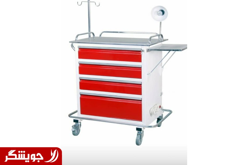 Four-drawer or five-drawer fiberglass or steel surface equipped with resuscitation board and place of capsule and examination lamp and medicine box and place of safety box and bucket