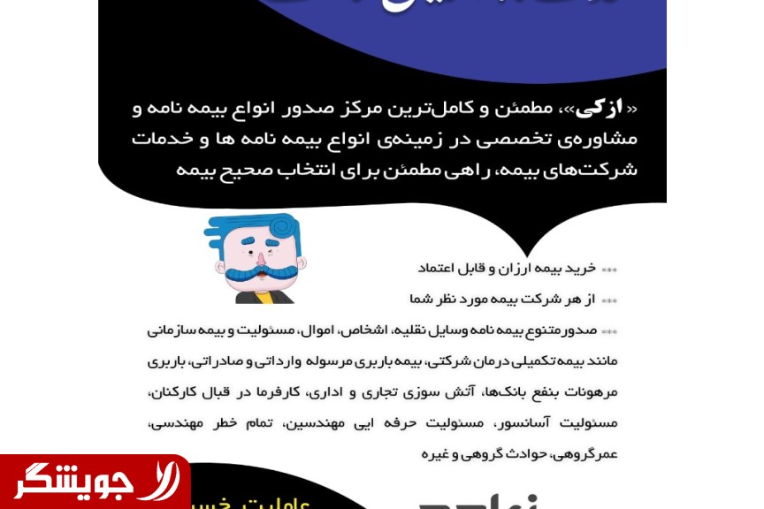 Azki ", the safest and most complete online insurance consulting and selection center. Safe to choose the right insurance. _ Buy cheap and reliable insurance _ Issuance of insurance policy as soon as possible and in the shortest time with the appropriate discount and with your insurance company. _ Issuance of various insurance policies for vehicles, persons , Property, Liability and Organizational Insurance such as Complementary Medical Insurance, Cargo Insurance for Imported and Exported Remittances, Cargo Borrowing for Banks, Commercial and Administrative Fires, Employer to Employees, Elevator Liability, Professional Liability of Engineers, All Engineering Risks, Group Life, Accidents Group, etc. Our goal is your comfort. Sales agency Azki.com Khosravani