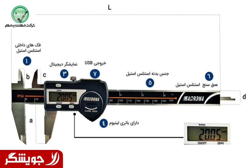 • Material of the body and components: stainless steel (anti-rust) The sale of Makrona calipers along with the valid calibration certificate of Mehr Engineering Company (Always Tracer scale) has ISO/IEC 17025 certification. Some customers of Mehr Engineering Company: Iran Khodro Saipa Sapco Renault Pars Mapna group Kerman Motor Sazeh Gostar Saipa Hepco driving force Village industrial group And... Address and telephone numbers of the head office: head office: Tehran, km 14 of Karaj special road, after the intersection of Iran Khodro, Ahad St., Rajaee Gharbi Alley, No. 54, Mehr Engineering Building Phone: 3-44782171 extension 200 Fax: (At the bottom of the ad) email : Mehr Engineering Company: info@mehr-eng.com Sales department: sales@mehr-eng.com Laboratory: laboratory@mehr-eng.com After-sales service department: salessupport@mehr-eng.com Department of Foreign Trade: commercial@mehr-eng.com Sales expert: Azam Omedi