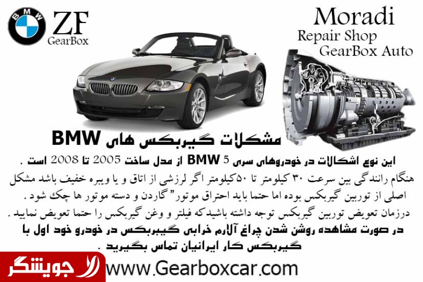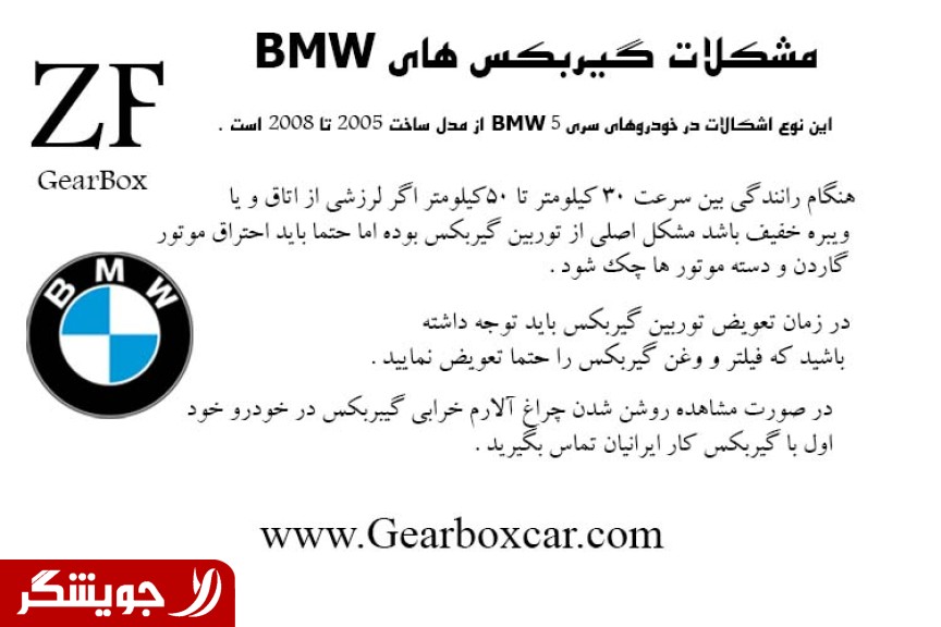 BMW gearbox problems This type of problem occurs in BMW 5 Series cars from 2005 to 2008. When driving between the speed of 30 km and 50 km, if there is a vibration from the room or a slight vibration, it is a problem The main problem is the turbine and gearbox, but the ignition of the "Garden" engine and the engines must be checked. When replacing the turbine of the gearbox, be sure to replace the filter and oil of the gearbox. If you see the alarm light of the gearbox failure in your car, first with Contact Iranian work gearbox.
