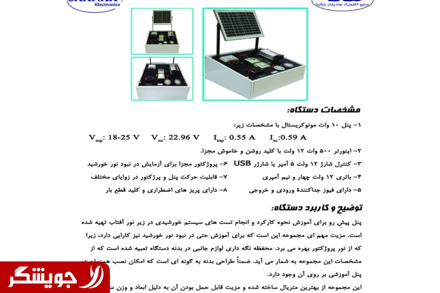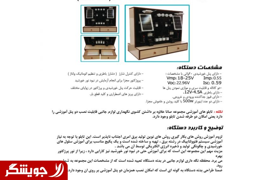 The front panel is prepared to teach how to operate and perform solar system tests under sunlight. An important advantage of the set is that it is effective for training even in the absence of sunlight, because it uses the light of the projector. The storage compartment for accessories is built into the body of the device, which is one of the features of this collection. In addition, the design of the body is such that it is possible to install two training panels on it at the same time. This collection is made of the best material and the advantage of its portability is significant due to its size and light weight. Portable solar cell educational set for all kinds of experiments under the sun. This set is a suitable tool for teaching students to set up a solar cell set that has a solar panel, inverter, switch and outlet, charge control, 200 volt load. and 12 volts and the body is suitable for transportation. Device specifications: 10 watt monocrystalline panel with the following specifications: Vmp: 18-25V Voc: 22.96 V Imp: 0.55A Isc: 0.59A 500 watt 12 volt inverter with separate on and off switch 12V 5A charge controller or USB charger 12 volt four and a half ampere battery It has a fuse that separates input and output Separate projector for testing in the absence of sunlight The ability to move the panel and projector in different angles It has emergency sockets and a load cut-off switch