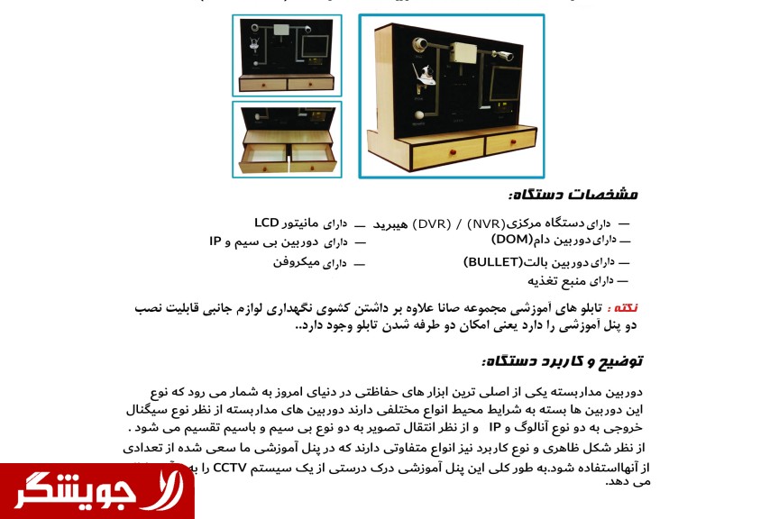 CCTV cameras are one of the most important security tools in today's world. These cameras have different types depending on the environmental conditions. CCTV cameras are of two types, analog and IP, and wireless. And it is divided by wire. In terms of appearance and type of application, there are different types of which we have tried to use some of them in our training panel. In general, this educational panel provides a correct understanding of a CCTV system to the novice.