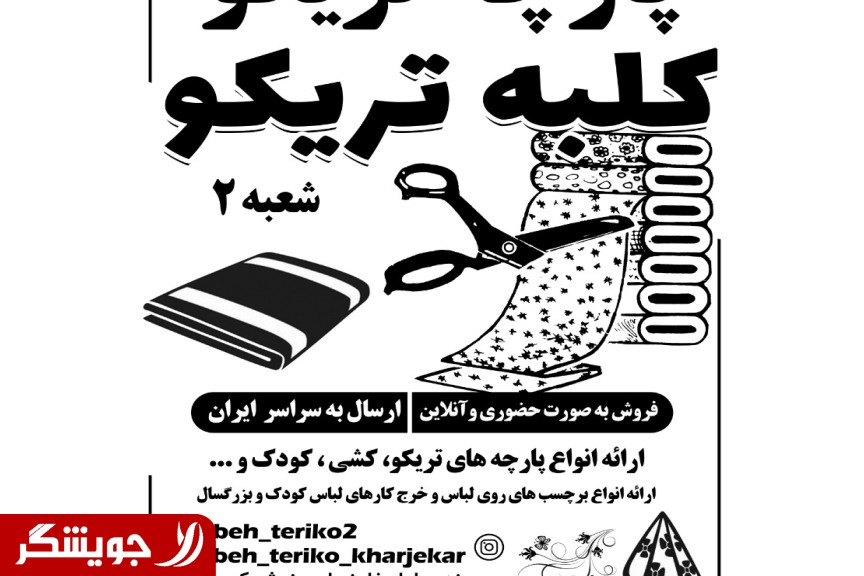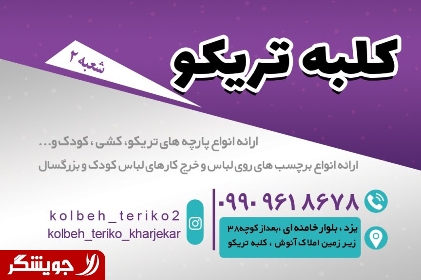 Triko hut cloth shop 2 provider of all kinds of stretch fabrics and tricots Send across the drawer Address: Yazd, Khamenei Boulevard, after 38 Alley, basement of the second shop Contact number: 09909618678 Instagram page: kolbeh_teriko2 kolbeh_teriko_kharjekar
