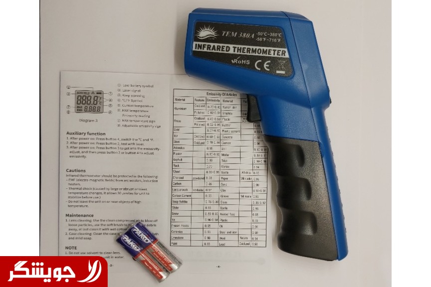 The TEM550A Laser Thermometer, a 550 -degree infrared thermometer with adjustable reflection coefficient from 0.1 to 1 to measure the temperature of the types of surfaces, especially inaccessible and dangerous surfaces. The laser or pointer marker in the TEM550a infrared heatometer is the tips that determine the target point for accurate measurement. For example, when measuring the heat resulting from an air conditioning channel, the laser helps prove your goal and assures you that you are close to the target point. Infrared thermometer (IR) is one of the industrial tools, not a medical for measuring body temperature. Among the features of this thermometer model are the color display to prevent visual disruption and readings and the maximum display of temperature.