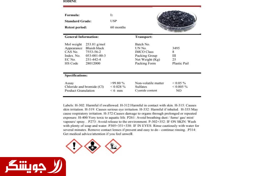 Iodine sales of Kansarakhzar company with purity of 8.99%, the only producer of iodine in Iran, for export from official sources, the minimum order is 3 tons.