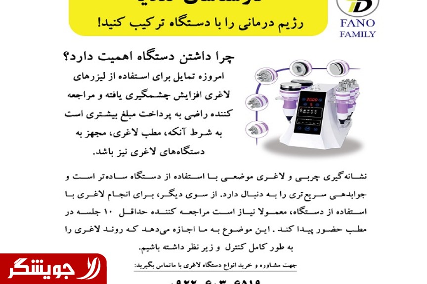 Nutrition Experts, Combine Diet Therapy with Device! Nowadays, the inclination to use slimming lasers has significantly increased. Clients seeking slimming are willing to pay a higher amount as long as the slimming clinic is also equipped with slimming devices. For example, they are not willing to pay more than 300 thousand Tomans for receiving a slimming diet, but they are ready to pay over 3 million Tomans for slimming using a device along with a dietary regimen. On the other hand, targeting fat and performing localized slimming using a device is very simple and the results are faster and more tangible, leading to client satisfaction. Also, for slimming with the device, the client usually needs to visit the clinic at least 10 sessions, which allows us to fully control and supervise the slimming process. Another advantage of using a slimming device along with diet therapy is the frequent presence of the client at your beauty clinic. From a marketing perspective, this causes the clinic to be busy. Creating a queue and a bustling clinic is very important and desirable. The Fano RF Cavitation slimming device is a beautiful device costing about one-tenth the price of other slimming devices, helping you attract and satisfy customers. By purchasing this practical device during the special sale from Fano Beauty Equipment Company, receive a beautiful trolley as a free gift. The price of the Fano RF Cavitation device is 25 million Tomans (easily, after a few months using the device, you will have earned the cost of the device). This device comes with a one-year warranty and ten years of after-sales service. For consulting and purchasing various slimming devices (RF Cavitation, Cryolipolysis, etc.) contact us.