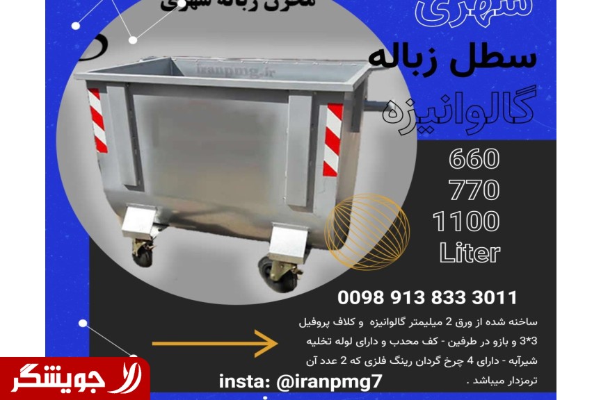 ** Manufacture of municipal waste reservoirs 660 **- 770 and 1100 liters with 2 miles of metal and colored galvanized. In the form of 4 wheels, 2 of which are brakes. Have a profile coil and bumpers in the body Convex Strong arms to evacuate with mechanized waste carriage machines Has the benign label for the night. Support 3 Mill welded at the wheel installation to strengthen the wheels Also made with black sheets and static colors cover in any requested color Urban Galvanized Bin - Galvanized Garbage Reservoir - Metal and Color Trash - Municipal Galvanized Garbage Production - Isfahan Galvanized Trash - Isfahan Apartment Trash - Trash for Martyrs Kingo - Garbage for Baharestan - Sale
