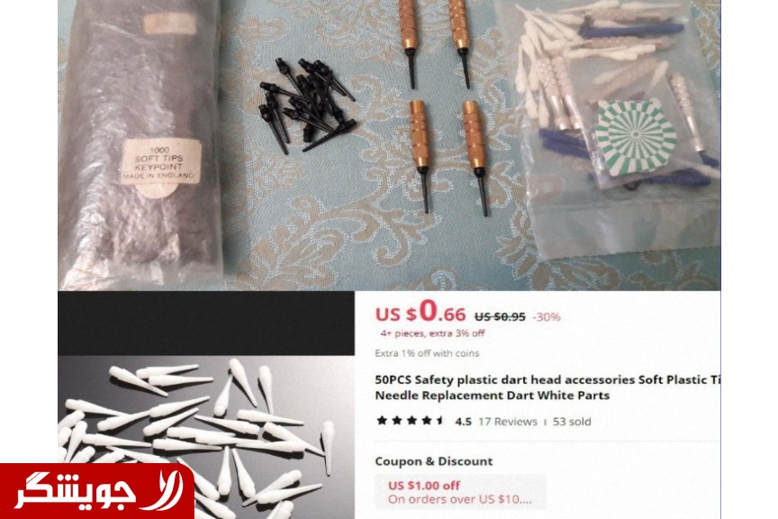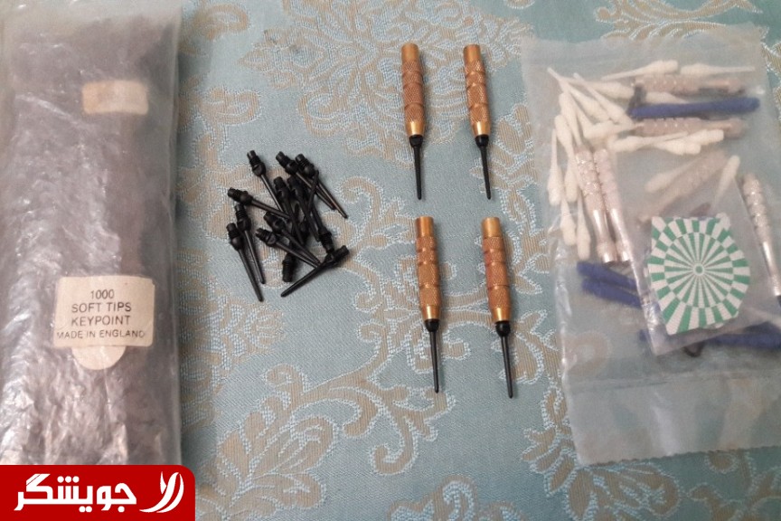 One hand -held 6 -hand darts, with replaceable safety plastic darts, purchased from the famous Intersport Sports Store from Austria with a green customs card priced at one million and 300 thousand tomans, and 37 of the Professional Brass Barrel Professional Darts and 27,000. Professional darts will be about 20 grams). And a handful of Safety Dart darts of high quality and durable British-made plastic (ideal for digital-professional darts) is priced at 28 USD (50 pcs purchasing at a reputable European site at 66 cents).