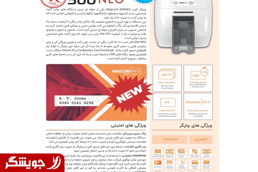 Print Speed: Up to 156 full -color cards and 720 monochrome cards per hour Card Capacity: 100 Input Card 70 outlet Card Printing Technology: Heat, Direct Printing Print quality: 300dpi The possibility of printing the logo personally