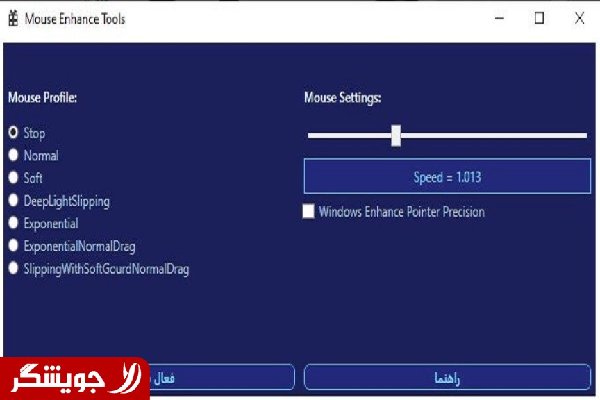 این برنامه دارای پروفایل های موس مختلفی می باشد که شما می توانید هر کدام را برای هر کاری که راحت تر هستید برگزینید این پروفایل ها مسیر حرکت موس را با الگوریتم های مختلف و پیچیده اصلاح می کنند همچنین از میله سمت راست می توانید سرعت موس را با دقت بالا تنظیم کنید.