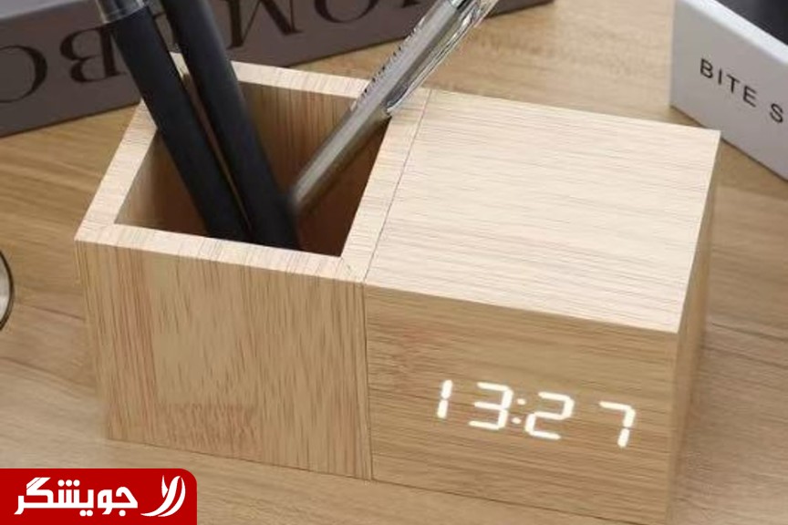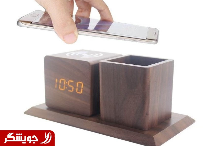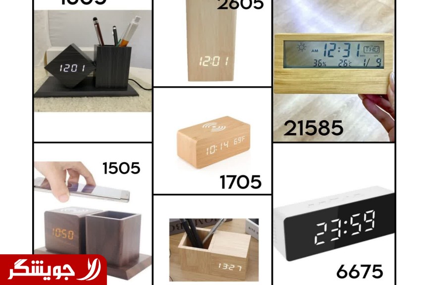 Code 1505: Wooden body, with pen holder Digital time display, alarm, thermometer, date display Wireless charger, sound sensor Color options: brown, cream, and smoky; 40 units per carton Price: 1,200,000 Toman