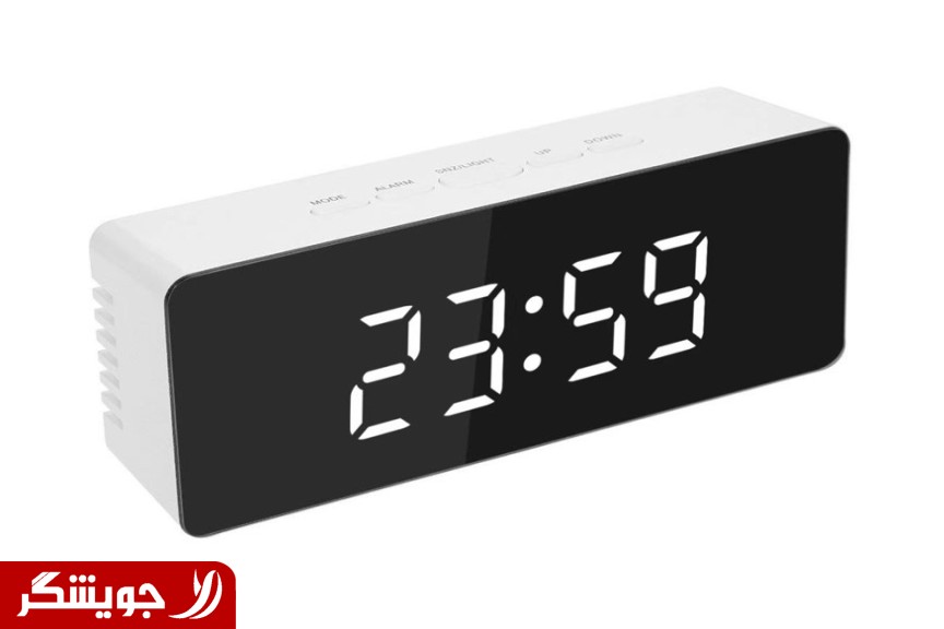 Code 6675: Digital time display, alarm, thermometer, date display Color options: white and black; 100 units per carton Price: 580,000 Toman