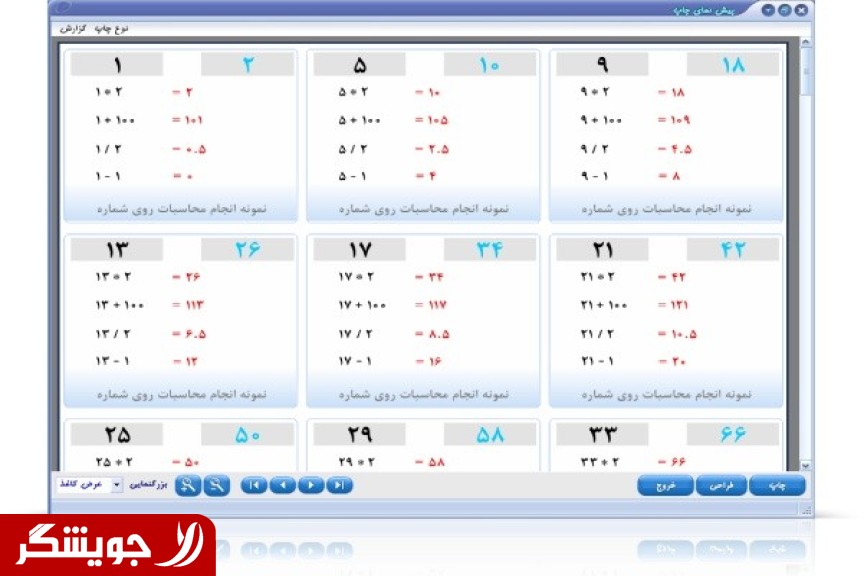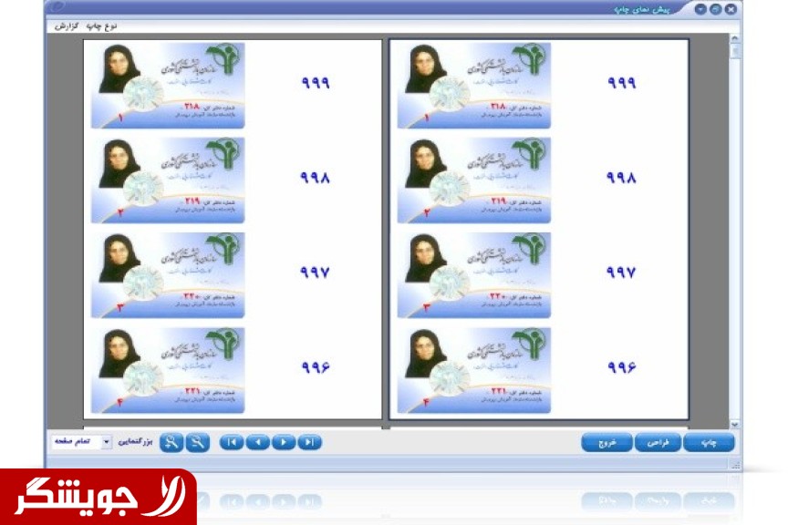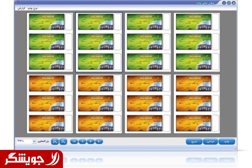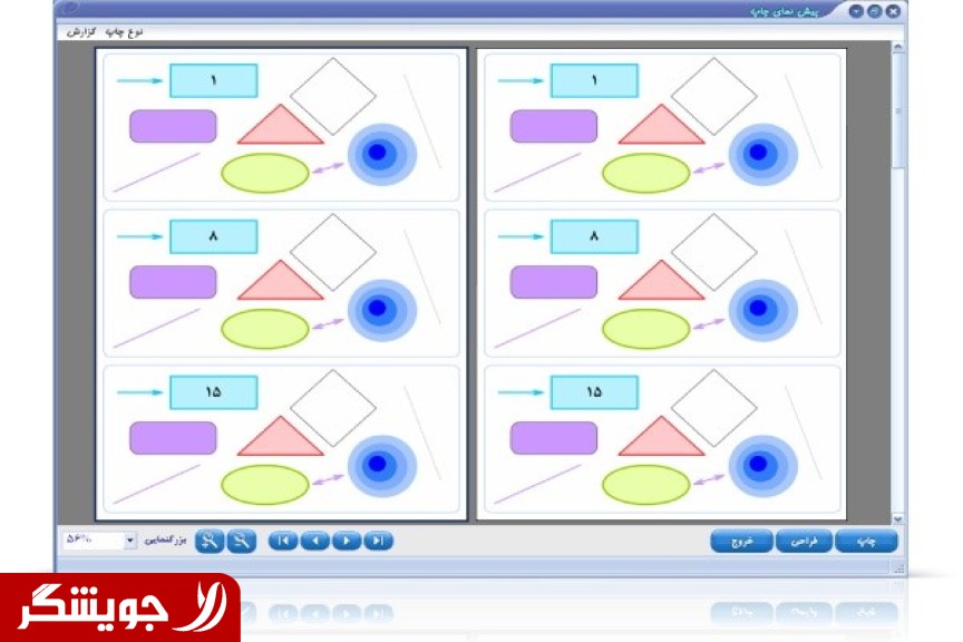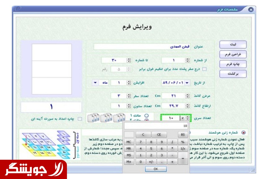 توسط این نرم افزار امکان طراحی یک فرم کامل در یک صفحه کاغذ یا چند فرم در یک صفحه به صورت سطری و ستونی وجود دارد ، به عنوان مثال میتوانید فاکتوری در سایز A5 را طراحی نمایید و آنرا شماره بزنید یا یک دفترچه قسط که صفحه A4 را به سه ردیف امساوی تقسیم میکند طراحی کنید و هر سه قسمت را جداگانه شماره بزنید ، البته فقط نیاز به طراحی یک قسمت میباشد و فرم طراحی شده در قسمتهای دیگر به صورت اتوماتیک تکرار خواهد شد.