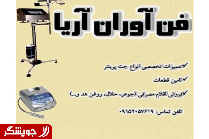 شرکت فن آوران آریا مجری تخصصی تعمیرات، نگهداریی، سرویس و همچنین تهیه ی اقلام مصرفی (مرکب، روغن هد، حلال و اسپری شست و شو) و قطعات انواع جت پرینترهای دومینو، ویدئوجت، لینکس و متسا مفتخر است تا در صورت نیاز صنایع مختلف به خدمات تعمیر، نگهداری و تهیه اقلام مصرفی مرتبط با جت پرینتر، با شرکت ها تولیدی صنعتی همکاری نماید.