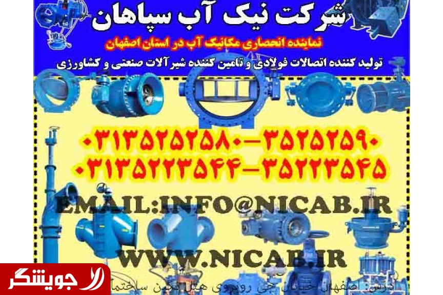 شرکت نیک آب سپاهان نماینده رسمی و انحصاری مکانیک آب در استان اصفهان ، تولید کننده اتصالات فولادی و تامین کننده شیرآلات و ملزومات پروژه های آبرسانی و ایستگاه های پمپاژ از قبیل: شیرهای پروانه ای، شیرهای کشویی، سوزنی، گلوب، هاول بانگر، شیرهای کنترل اتوماتیک، شیرهای یکطرفه، شیرهوا، صافی ها،شیرها با کاربری خاص،شیرهای انتهای خط،اتصالات قابل پیاده کردن،فلنج های فولادی،پمپ های خانگی و صنعتی،شیرهای آتشنشانی،انواع لرزه گیر،شیرآلات واتصالات پلی اتیلن،محرک های برقی، ابزار دقیق،شیرهای کنترل هیدرولیکی وپنوماتیکی،پکیج کامل تانک ضربه گیر و ...و ابداع نوعی فلنج با نام انحصاری نیک فلنج که میتوان آن را تحولی در زمینه اتصالات فولادی دانست.