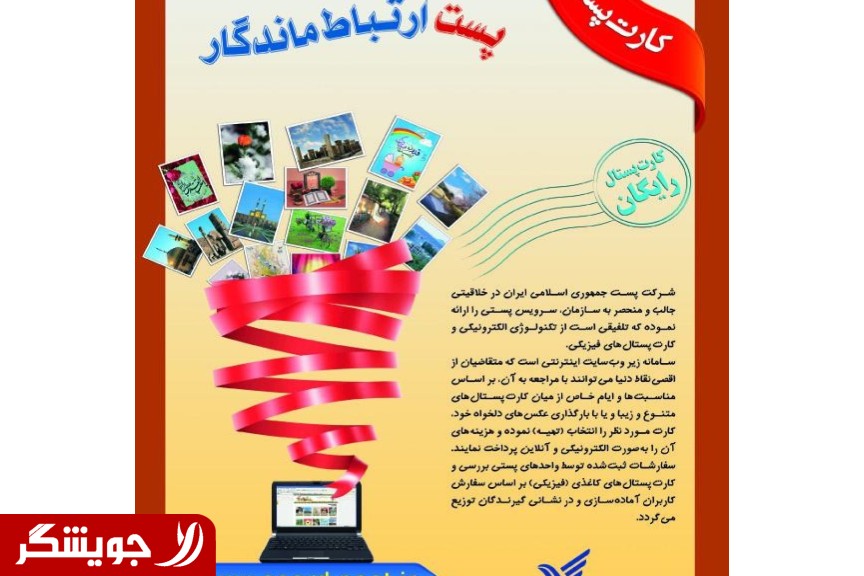 با نزدیک شدن ایام نوروز می توانید با استفاده از کارت پستال الکترونیکی پست عزیزانتان را شگفت زده کنید.شما می توانید یک عکس خاطره انگیز را با متن مورد نظر خود برای چاپ روی کارت پستال ارسال کنید و با حداقل هزینه آن را برای شخص مورد نظر ارسال کنید.شما تمام این مرحل را تنها از طریق یک سیستم کامپیوتر و در چند دقیقه از طریق سایت ecard.post.ir می توانید انجام دهید و تبریکات خود را به شیوه ای خاص به دوستان و عزیزان خود اعلام کنید.