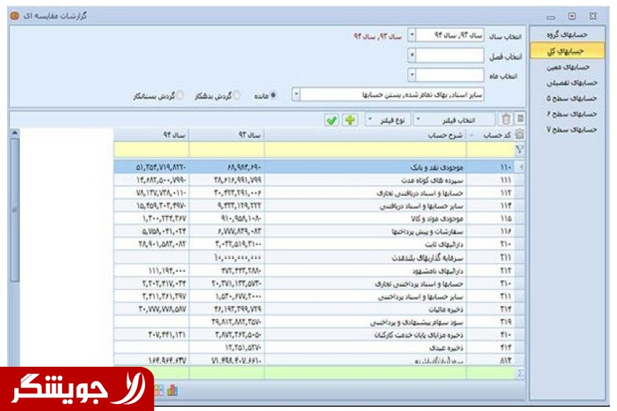 • قابلیت تهیه گزارش از حساب ها به صورت چند سطحی و چند ستونی