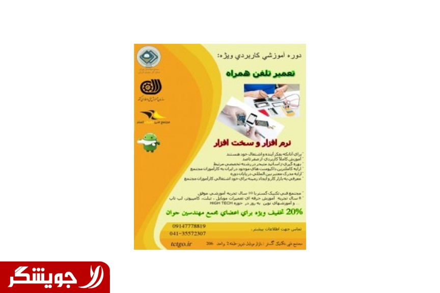 *- مجتمع فنی تکنیک گستر افتخاردارد بعنوان اولین ورسمی ترین مرکز آموزش تعمیرات موبایل به صورت تخصصی در تبریز با مجوز رسمی ازسازمان فنی و حرفه ای ، در خدمت جوانان جویای شغل پردرآمد، ارایه خدمت نماید. *- اولین و تنها دارنده مجوز رسمی برای آموزش موبایل و دیپلم در آذربایجان شرقی *- 367 نفر از کارآموزان مجتمع فنی تکنیک گستر(تاتاریخ 95/2/12) ،دررشته تعمیر موبایل،مشغول کار شدند. درشهر های: تبریز، ارومیه، بستان آباد، اهر، ایلخچی، میانه،جلفا،آستارا، مرند، بناب، خسروشهر،زنجان،مشکین شهر، ملکان،نقده، و باکو. *- تجربه 9سال آموزش موفق و 7سال آموزش تخصصی تعمیر موبایل *- دارای 3کارگاه مجهز و تخصصی استاندارد در سطح شهر، *- بهره گیری از اساتید با تجربه و به روز و فعال در بازار کار، *- اعزام کارآموزان جهت طی دوره کاراموزی برای کسب تجارب عینی بازار کار، *- معرفی به بازار کار برای کارآموزان فارغ التحصیل شده از این مجتمع. *- ارائه مدرک فنی و حرفه ای با کد بین المللی جهت دریافت پروانه کسب ووام خوداشتغالی *- آموزش تضمینی در سطوح حرفه ای و تحلیل گوشی های به روز بازار. *- درصد قبولی 98% در آزمون های سازمان فنی و حرفه ای ، *- ارائه Documents های موبایل به روز موجود در سطح کشور به کار آموزان مجتمع در طول دوره آموزش تعمیر موبایل *-دوربین مداربسته-آیفون تصویری و اعلان حریق-تعمیر کامپیوتر و لپ تاپ-تابلو روان -دوره های رباتیک ، کامپیوتر. گردشگری. *- ارایه مهارت دیپلم در کمترین زمان ممکن .
