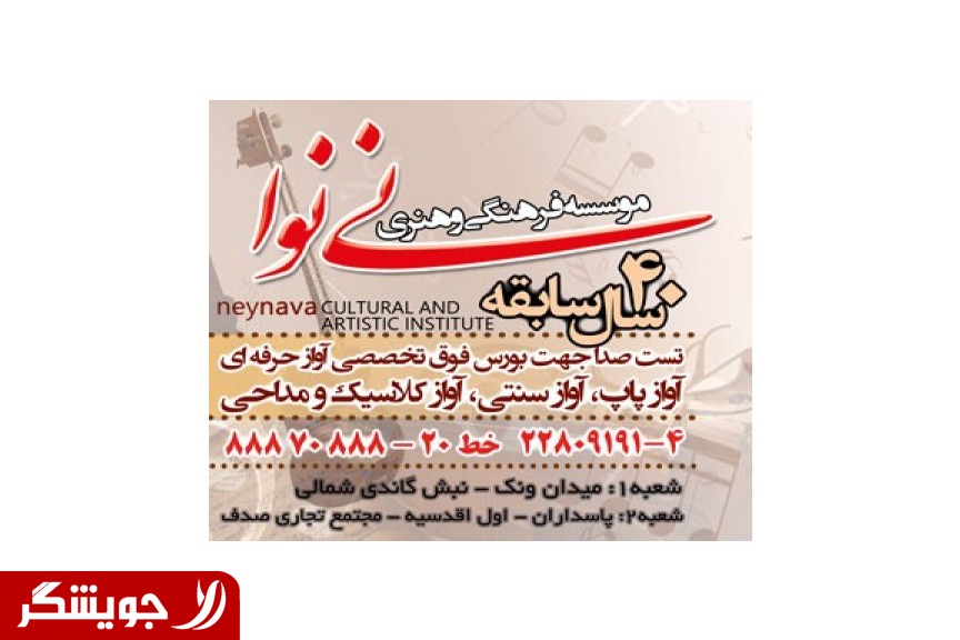 مؤسسه فرهنگی و هنری نی نوا معتبرترین و باسابقه ترین مجموعه آموزشی ساز و آواز (40سال سابقه درخشان) و معرفی استعدادهای جدید به جامعه هنری کشور مفتخریم که همواره محبوبترین و برجسته ترین هنرمندان کشور را به جامعه هنری تقدیم داشته ایم ستاره ها در یک چشم بهم زدن ساز و آواز آموختند کلینیک فوق تخصصی آواز ایران در جهان تست صدا و معرفی به صدا و سیما تست صدا جهت بورس فوق تخصصی آواز حرفه ای (آواز پاپ، آواز سنتی، آواز کلاسیک و مداحی) تولید آلبوم، کلیپ توسط برجسته ترین آهنگسازان و کارگردانان و معرفی به صدا و سیما مسابقات سراسری آواز حرفه ای کشور: مؤسسه فرهنگی و هنری نی نوا جهت تولید آلبوم های مجاز و معرفی افراد منتخب اسپانسر میشود سایر اسپانسران محترم، کارگردانان هنری سینما، فیلمسازان و تهیه کنندگان محترم صدا و سیما می توانند شخصا از بین شرکت کنندگان در مسابقات انتخاب داشته باشند برگزارکننده باشکوه ترین و بزرگترین کنسرتها، جشنواره های موسیقی در ایران و خارج از کشور اعزام محبوبترین هنرمندان و مجربترین گروه های هنری به داخل و خارج از کشور(اقصی نقاط جهان) فقط در چندماه ساز مورد علاقه خود را بیاموزید کنسرتهای هنرجویی در خانه هنرمندان نی نوا دربند شمیران اعطای گواهینامه معتبر در پایان هر دوره آموزشی ارائه کارت عضویت خانه هنرمندان نی نوا جهت استفاده هنرجویان و همراهانشان از فضاهای زیبا، دل انگیز و برنامه های هنری خانه هنرمندان نی نوا واقع در دربند شمیران 1- آموزش پیانو 2- آموزش کیبورد 3-آموزش گیتار کلاسیک 4-آموزش گیتار پاپ 5- آموزش گیتار فلامنکو 6- آموزش گیتار پاپ فلامنکو 7-آموزش گیتار راک 8- آموزش گیتار متال 9- آموزش گیتار جاز بلوز 10-آموزش گیتار الکتریک 11-آموزش گیتار بیس 12-آموزش فلوت کلیددار 13-آموزش فلوت ریکوردر 14-آموزش پرکاشن 15-آموزش تومبا 16-آموزش سازدهنی (هارمونیکا) 17-آموزش کلارینت 18-آموزش آکاردئون 19-آموزش ترومپت 20-آموزش ترومبون 21-آموزش هورن 22- آموزش ساکسیفون 23-آموزش سنتور 24-آموزش تار 25-آموزش سه تار 26-آموزش عود 27-آموزش کمانچه 28-آموزش ویلون ایرانی 29-آموزش نی 30-آموزش رباب 31-آموزش قیچک 32-آموزش قانون 33-آموزش تنبک 34-آموزش دف 35-آموزش دایره زنگی 36-آموزش قرنی 37-آموزش تنبور 38-آموزش دیوان 39- آموزش ویلون کلاسیک 40-آموزش ویلون آلتو 41- آموزش ویلون سل 42- آموزش کنترباس 43-آموزش سلفژ 44-دیکته موسیقی 45-آواز جهانی 46- هارمونی 47- فیزیک صوت 48- سازشناسی 49-ارکستراسیون 50-پارتیتورنویسی 51-مایع شناسی موسیقی ایرانی 52-ردیف های سنتی 53-تاریخ موسیقی ایران و جهان 54- فوگ وانوانسیون 55-کنتر پوئن 56- آهنگسازی