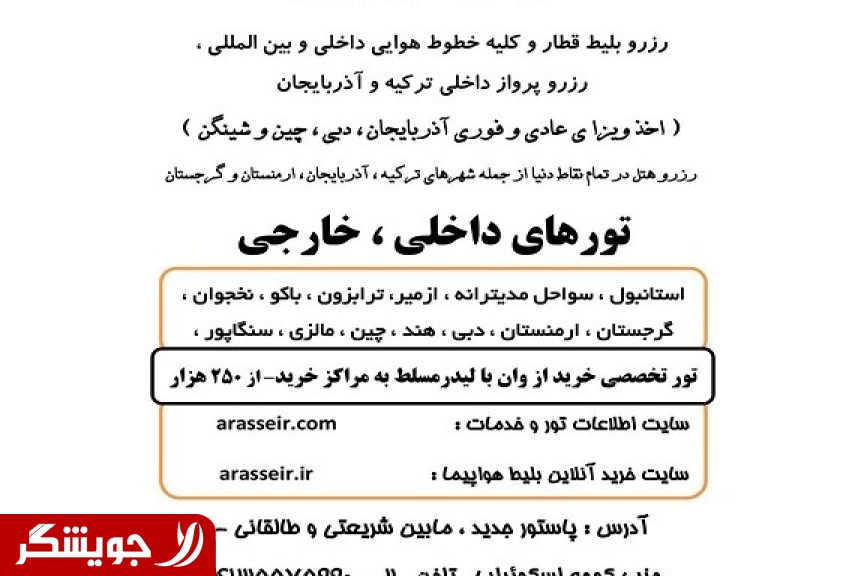 آراس سیرتبریز رزرو بلیط قطار و کلیه خطوط هوایی داخلی و بین المللی ، رزرو پرواز داخلی ترکیه و آذربایجان( اخذ ویزا ی عادی و فوری آذربایجان ، دبی ، چین و شینگن ) رزرو هتل در تمام نقاط دنیا از جمله شهرهای ترکیه ، آذربایجان ، ارمنستان و گرجستان آدرس : پاستور جدید ، مابین شریعتی و طالقانی - جنب کوچه اسکوئیلر / تلفن 2-(در پایین آگهی) شماره تلگرام (در پایین آگهی)/