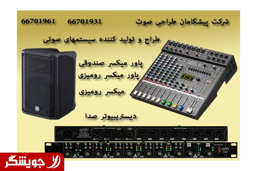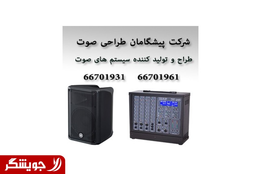 شرکت پیشگامان طراحی صوت : طراح و تولید کننده سیستمهای صوتی اکو آمپلی فایر ، میکسر صندوقی ، اکو میکسر پرتابل ، اکو صندوقی ، پاور میکسر برخی محصولات این شرکت : میکسر 4 کانال MX4 - میکسر 8 کانال MX8 - میکسر MC8 - اکو میکسر صندوقی - میکسر صندوقی با افکت پینگ پونگی – دیستریبیوتر صدا