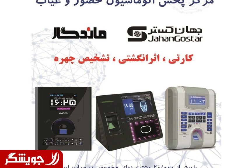 فروش و خدمات پس از فروش انواع اتوماسیون حضور و غیاب برند جهانگستر... دارای یکسال گارانتی... بیش از34000مشتری در سراسر ایران... حافظه جهت ثبت 262000 تردد... سنسور ضدخش با قابلیت تعریف 3اثرانگشت برای هر فرد... باطری داخلی جهت 4 ساعت کارکرد... تعریف شیفت ها و ساعت های متنوع کاری... ثبت مشخصات کامل پرسنل... گزارشات پیشرفته(کارکرد.کسرکار.اضافه کار.غیبت و...) درگاه ارتباطی شبکه.USB.RS232... انواع کارتی و اثرانگشتی و تشخیص چهره... برای مشاوره با ما تماس بگیرید...(در پایین آگهی)