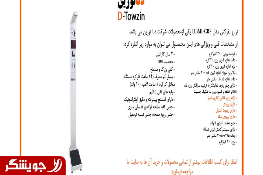 مشتریان عزیز می توانند مشخصات بیشتر ترازو قد و وزن مدل HBMI-CR را در زیر مشاهده کرده و در صورت وجود هر گونه سوال در رابطه با نحوه خرید ترازو قد و وزن و پرداخت محصول با کارشناسان فروش ما تماس حاصل فرمایند.