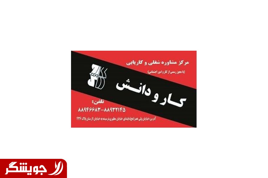 مرکز مشاوره شغلی کاریابی کار ودانش داخلی و بین المللی بامجوز رسمی از وزارت کار وامور اجتماعی و تعاون تامین نیرو کار داخل و خارج ازکشور تخفیف بیمه برای کارفرما 88946683-88932145