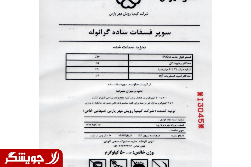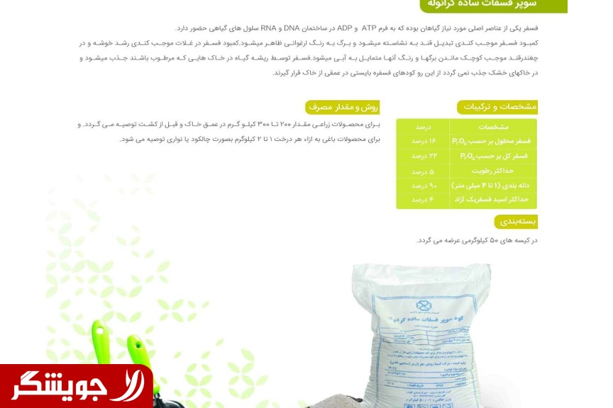 مزایای ویژه کود سوپر فسفات ساده: سوپر فسفات ساده حاوی 22 درصد فسفر کل بصورت P2O5 میباشد و حداقل فسفر محلول در آب آن 16 درصد بوده ، ضمنا این کود به دلیل داشتن 4 درصد اسید فسفریک و 10 درصد گوگرد علاوه بر کنترل شوری خاک ،در تعدیل و تنظیم pH خاک نقش موثری دارد و همچنین با دارا بودن کلسیم از منبع سولفات کلسیم ، قادر است نیاز این عنصر را در محصولات کشاورزی و بویژه درختان میوه تامین نماید. شکل دانه ای این کود باعث سهولت استفاده و توزیع و جذب سطحی آن توسط ریشه گیاهان می شود. این کود به دلیل داشتن اسید فسفریک و منابع سولفات، بافت خاک را متخلخل و باعث نفوذ آب تا ریشه گیاه و جذب آن توسط گیاه می شود.