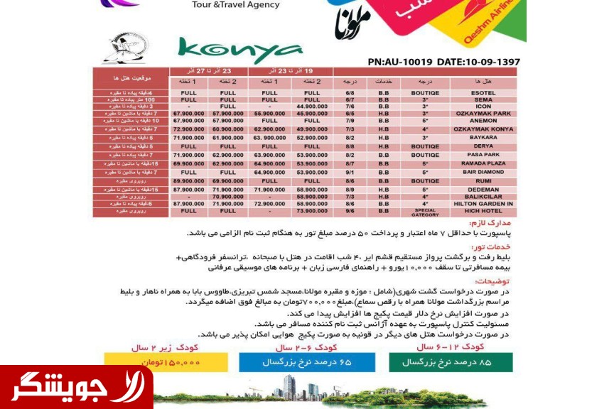 در صورت درخواست گشت شهری(شامل موزه و مقبره مولانا)-مسجد شمس تبریزی-طاووس بابا به همراه ناهار و بلیط مراسم بزرگداشت مولانا به همراه رقص سماع مبلغ 700هزار تومان به مبالغ فوق اضافه می گردد.