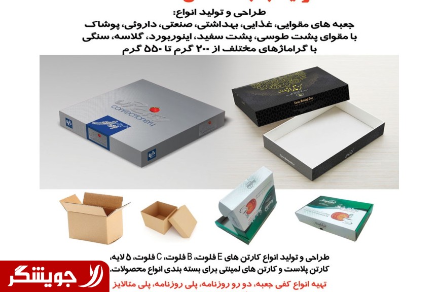 آشنا به کلیه سیستمهای چاپ برای انواع چاپهای: افست – مسطح – تامپو –سیلک - uvموضعی - انواع چاپهای صنعتی روتوگراور - هلیوگراور - فلکسو - طلاکوب - چاپهای لارج فرمت و... طراحی: آرم و لوگو – آیکون ها – تایپوگرافی - کاتالوگ و بروشور – کتاب و مجله –تراکت - پوستر - ستهای اداری - جعبه – کارتن – بسته بندی – لفافه های بسته بندی - لیبل های پشت چسب دار و بدون چسب و ... طراحی و تولید انواع: جعبه های مقوایی ، غذایی ، بهداشتی ، صنعتی ، داروئی ، پوشاک با مقوای پشت طوسی ، پشت سفید ، اینوربورد ، گلاسه ، سنگی با گراماژهای مختلف از 200 گرم تا 550 گرم طراحی و تولید انواع کارتن در ابعاد مختلف کارتن های لمینتی، E فلوت، B فلوت، 3 لایه ، 5 لایه و کارتن پلاست طراحی و چاپ لیبل و انواع برچسب و لیبل های حرارتی لیبل های پشت چسبدار و بدون چسب بصورت رول و شیت گلاسه - PVC - لیبل های شفاف (ترانسپرنت) - متالایز - صدفی هولوگرام - انواع ریبون و ... هر آنچه نیاز شماست