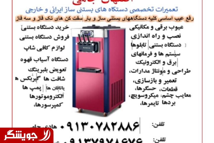 رفع عیب برقی و مکانیکی و بستن سیستم های کیفیت بستنی تعمیر و باز سازی دستگاه های بستنی قیفی فرسوده و ازکار افتاده قدیمی رفع عیب و تعویض بلبرینگ ها، شافت ها و یاتاقان ها رله ها و خازن ها ، الکتروموتورها ، گریبگس ها ، و کمپرسورها ، طراحی و مونتاژ تابلوها و مدارات فرمان برق و الکترونیک رفع عیب اساسی کلیه دستگاه های بستنی ساز و بارسفت کن های تک فاز و سه فاز تعمیرات تخصصی دستگاه های بستنی ساز ایرانی و خارجی